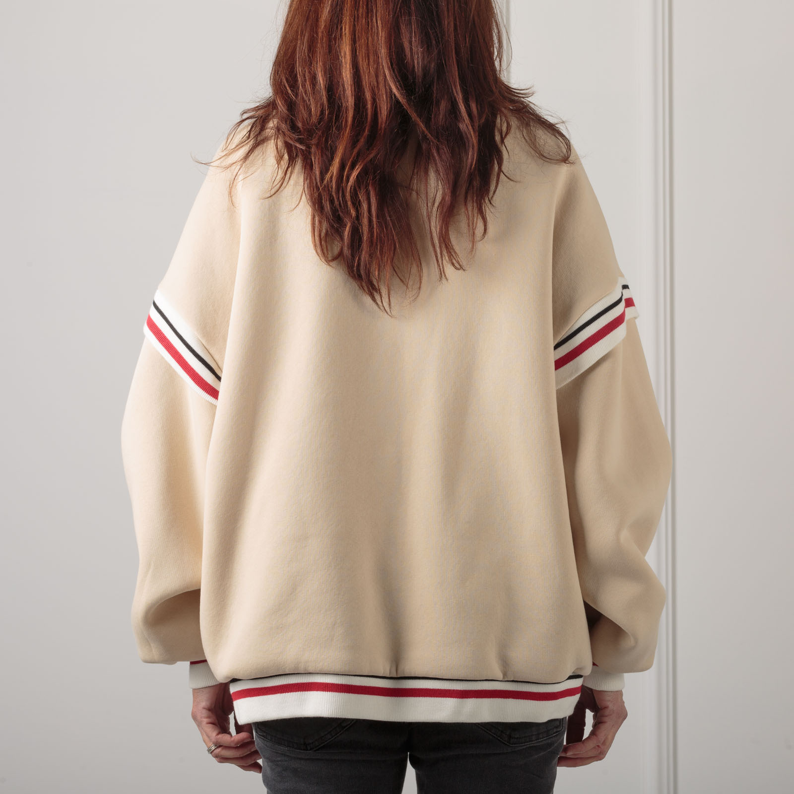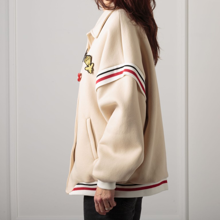 MAXI BOMBER REALIZZATO IN FELPA MOLTO MORBIDA MA SOSTENUTA ,ABBOTTONATURA SUL DAVANTI ,POLSINI E COLLETTO REALIZZATI IN MAGLIA CON MOTIVO RIGA ,FODERATO INTERNAMENTE IL CAPO OLTR AD ESSERE UNA FELPA PUO' ESSERE INDOSSATO ANCHE COME GIUBOTTO DA MEZZA STAGIONE. COLORE BEIGE