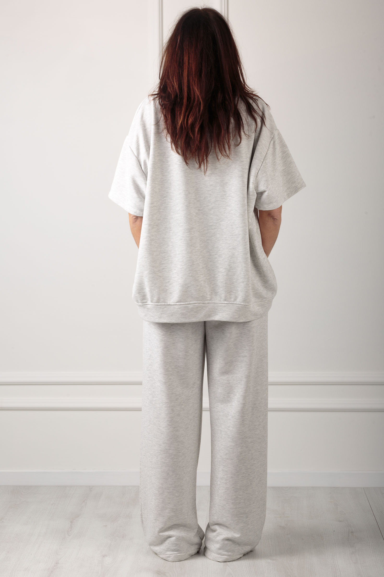 FELPA GARZATA,CON MICRO GLITTER,TAGLIO OVER MANICA CORTA LUNGHEZZA AL GOMITO,GIROCOLLO ,MOLTO CONFORTEVOLE ,TESSUTO MORBIDISSIMO.