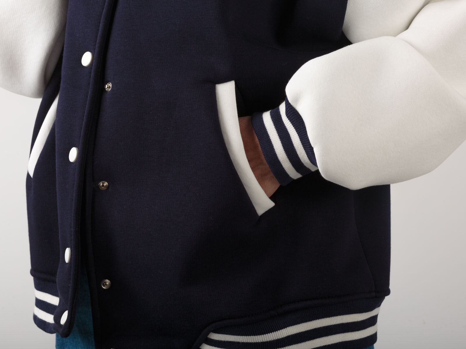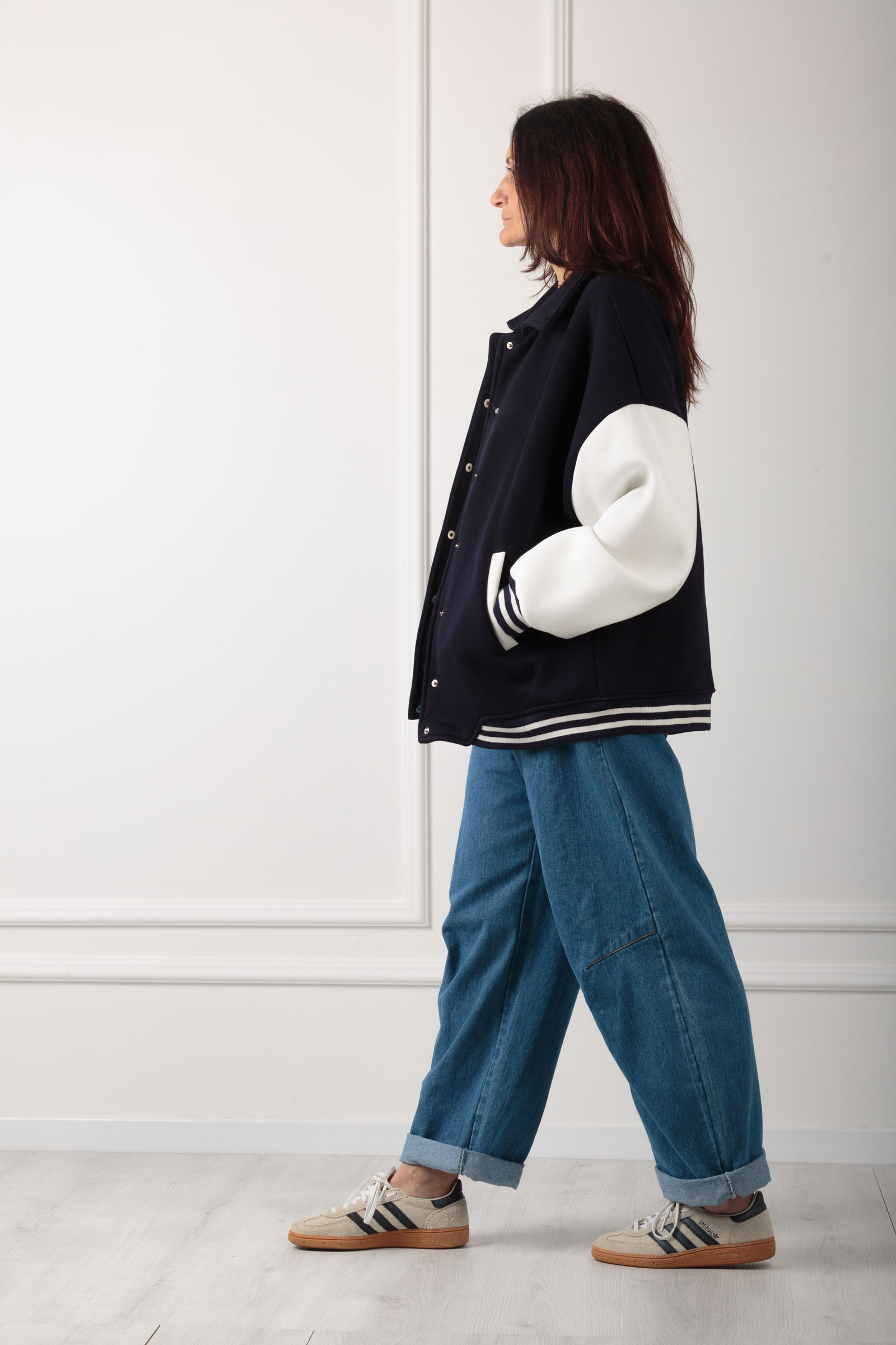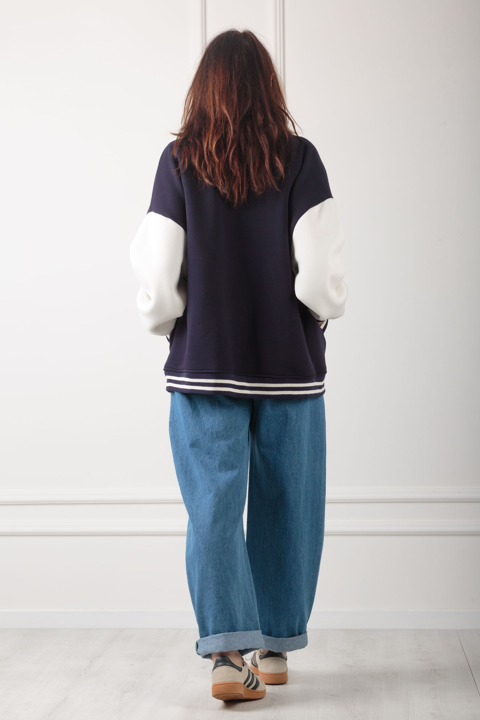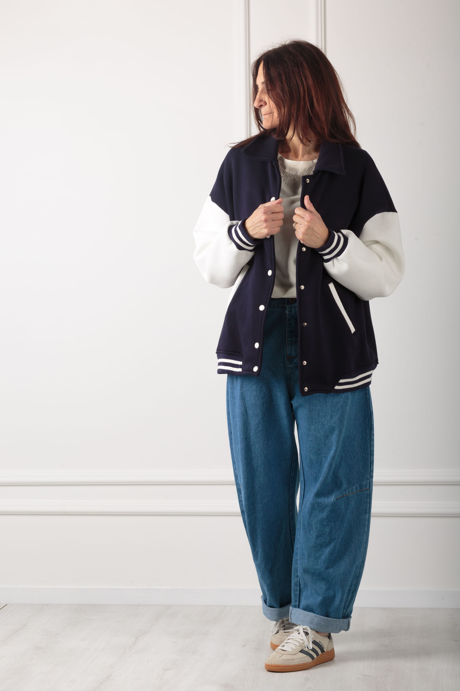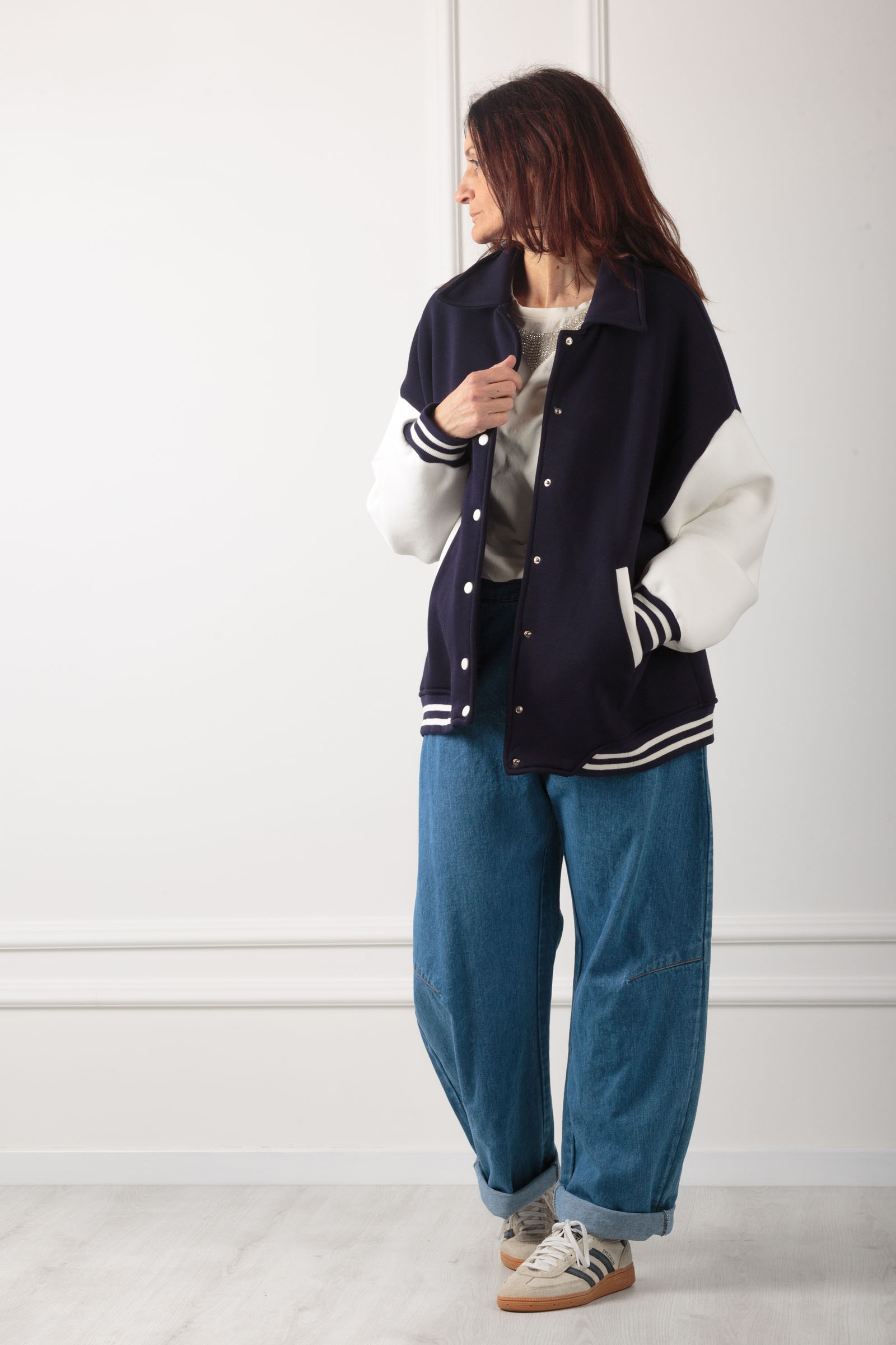 GIACCA BOMBER STILE COLLEGE ,REALIZZATIN FELPA DI COTONE MORBIDISSIMA ,VARIANTE BLU CON MANICA A CONTRASTO IN BIANCO.ALLACCIATURA CON BOTTONI A PRESSIONE E POLSINO IN MAGLIA. STILE COLLEGE ANNI 80 ,DA INDOSSARE SICURAMENTE SU DENIM O ANCHE GONNA .