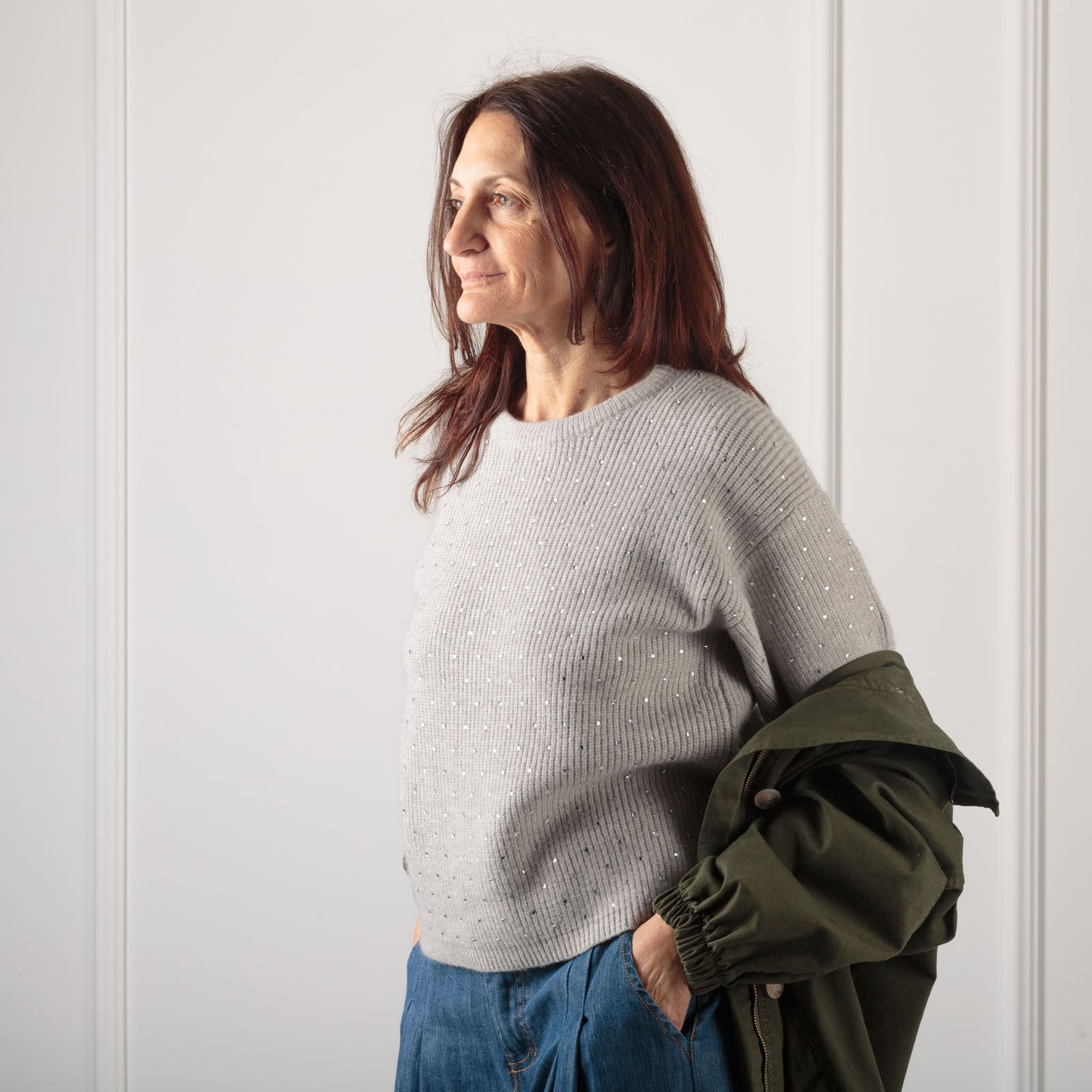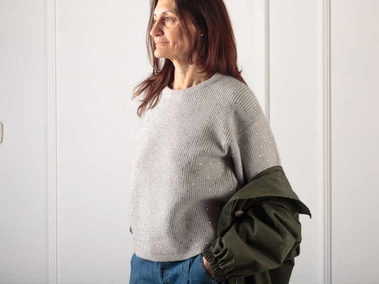 MAGLIA A SCATOLA MEZZA MANICA ,APPLICAZIONE DI PICCOLI STRASS DIAMANTINO ,GIROCOLLO,MOLTO MORBIDA PER UN CONFORT OTTIMALE DA MEZZA STAGIONE