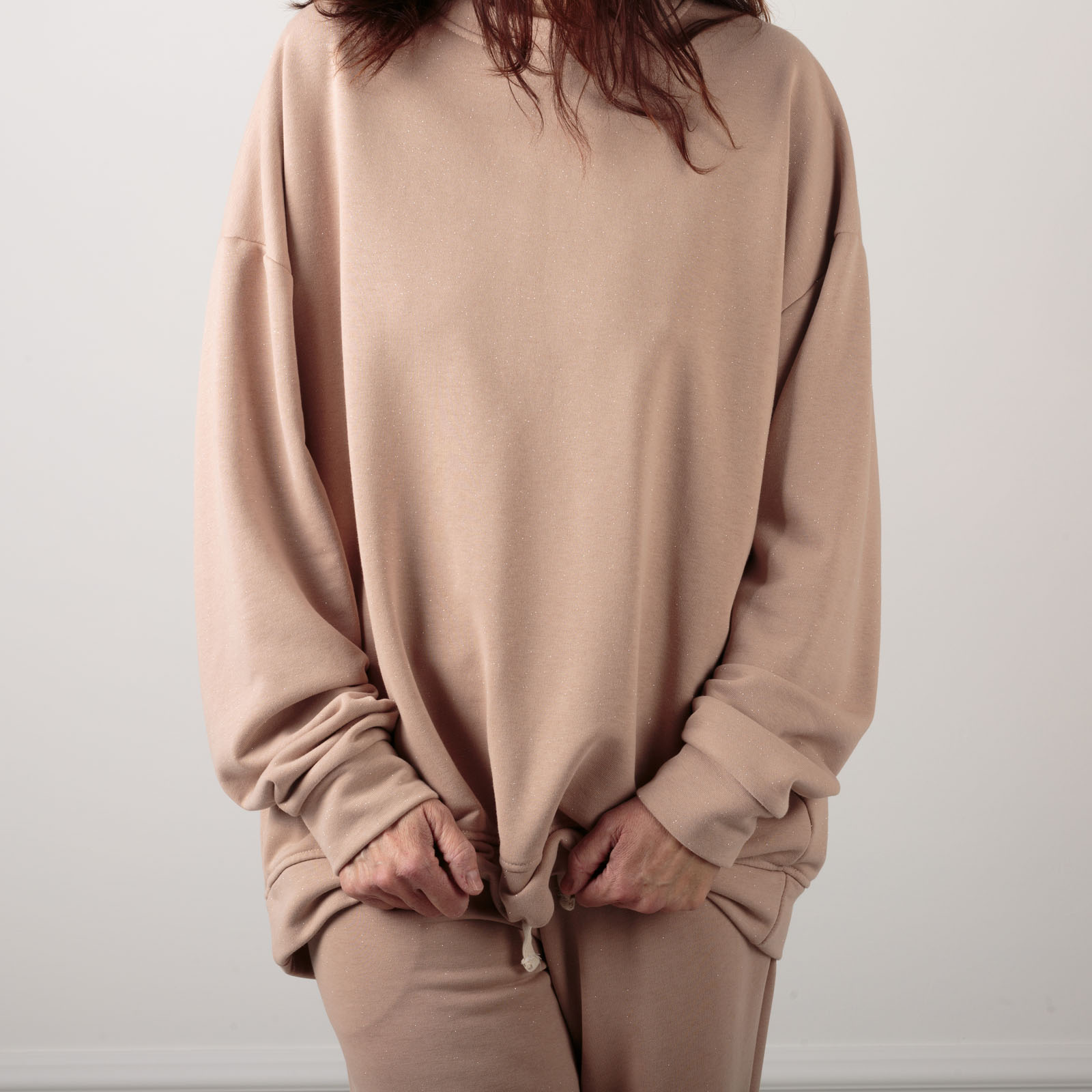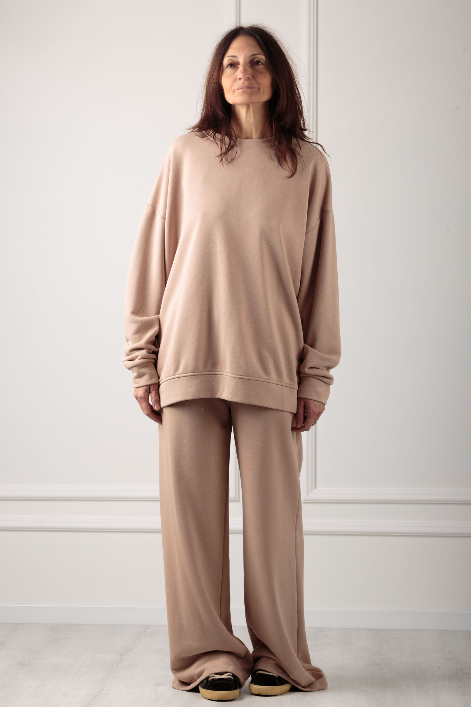 FELPA GARZATA,CON MICRO GLITTER,TAGLIO OVER MAXI LUNGHEZZA,GIROCOLLO ,MOLTO CONFORTEVOLE ,TESSUTO MORBIDISSIMO. MANICA LUNGA