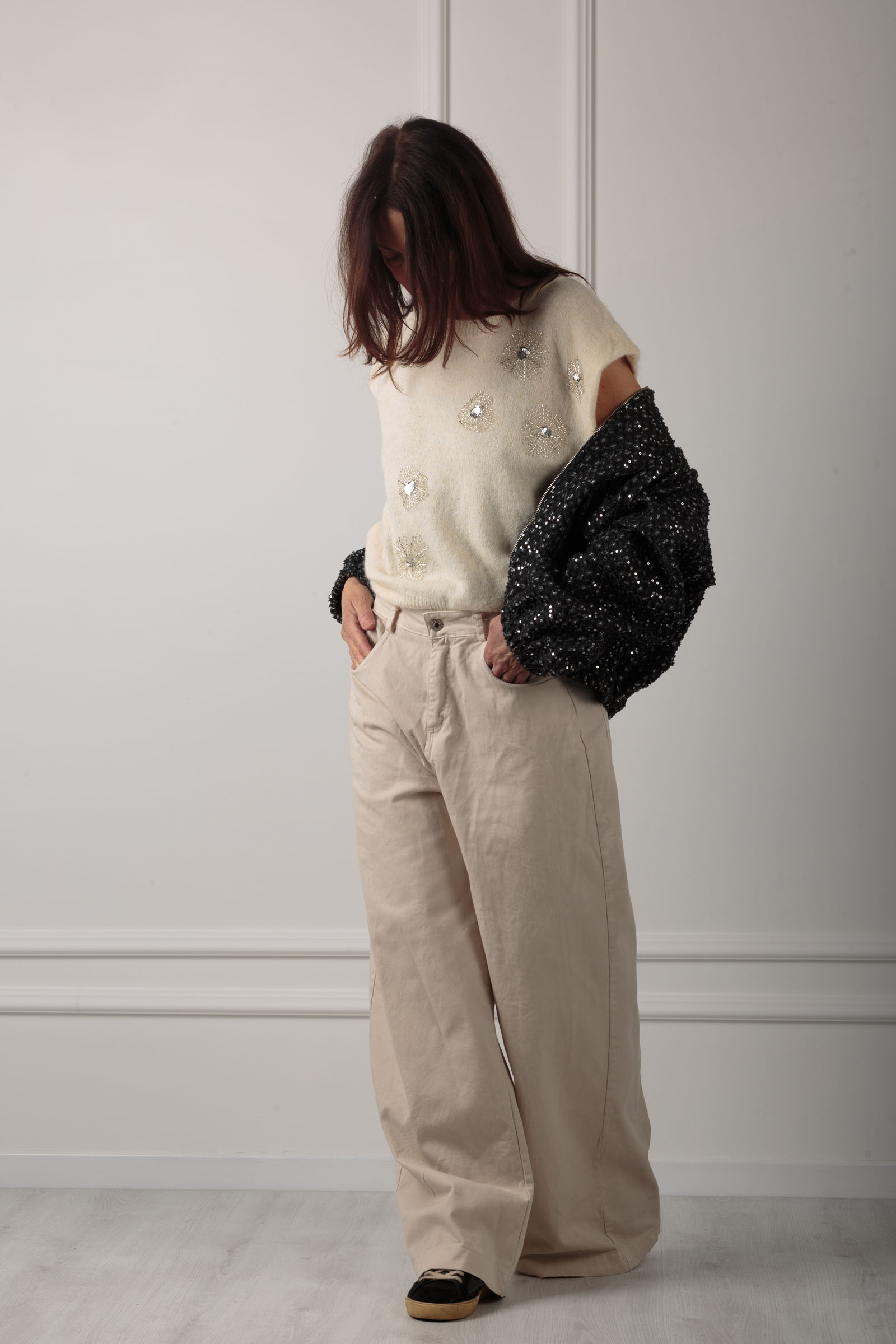 MAGLIA SMANICATA CON APPLICAZIONI SUL DAVANTI ,MOLTO MORBIDA AL TATTO ,CONFORTEVOLE,OTTIMA VESTIBILITA',TAGLIO DRITTO.