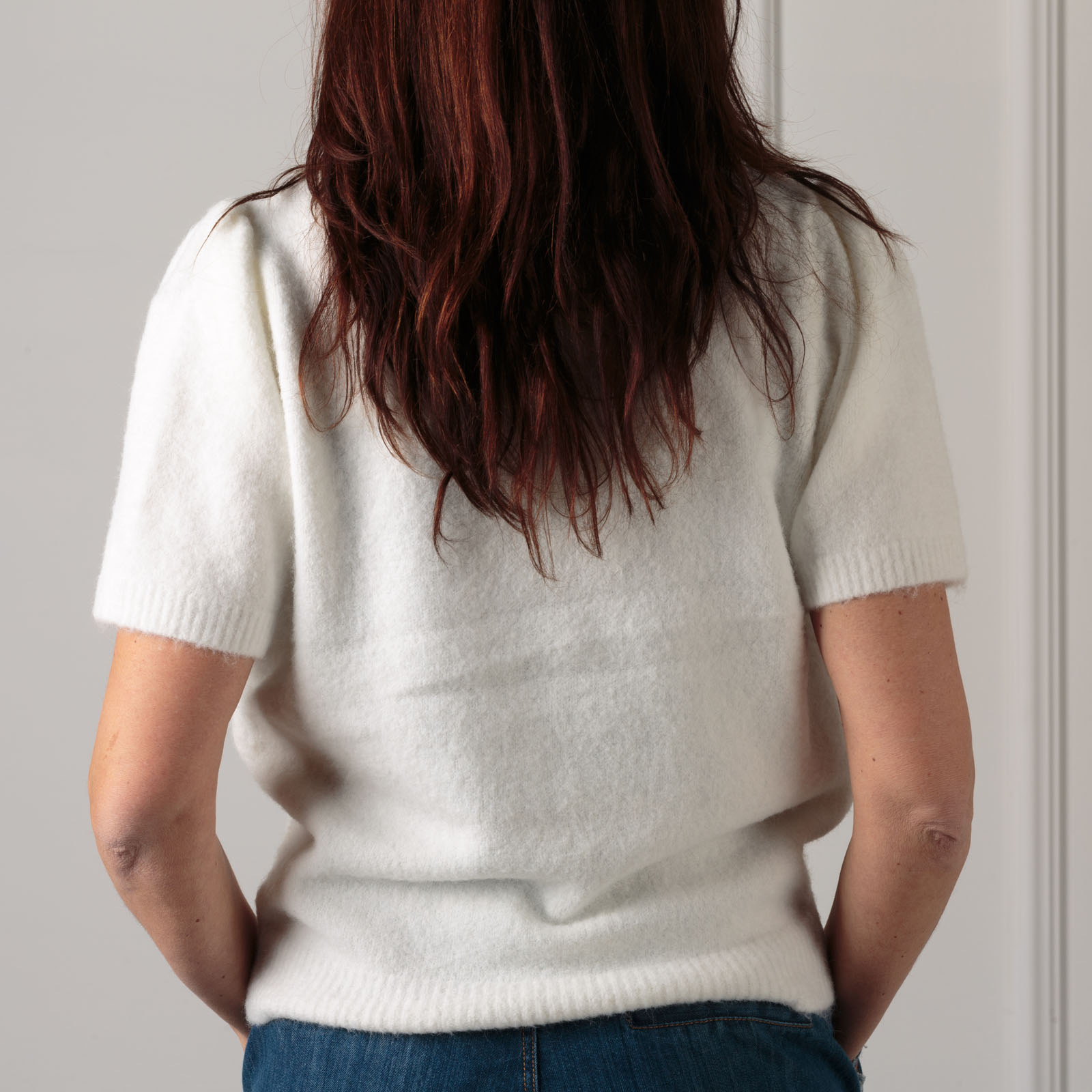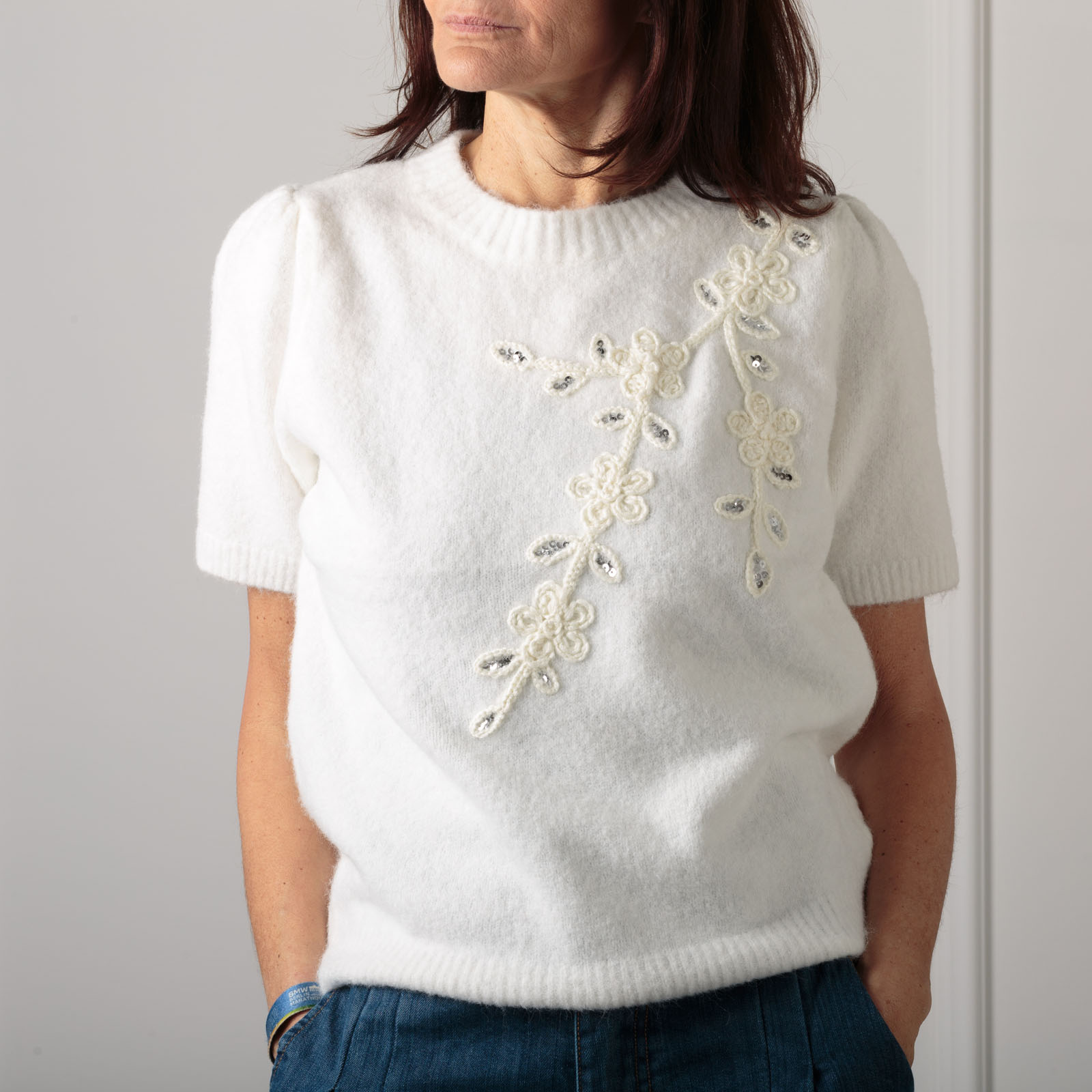 MAGLIA A MEZZA MANICA CON RIPRESA SULLA SPALLA PER CREARE UN LEGGERO EFFETTO PALLONCINO,MOTIVO RICAMO CON AGGIUNTA DI PAILLETTES SULLA PARTE FRONTALE,GIROCOLLO,MOLTO MORBIDA PER UN CONFORT OTTIMALE DA MEZZA STAGIONE